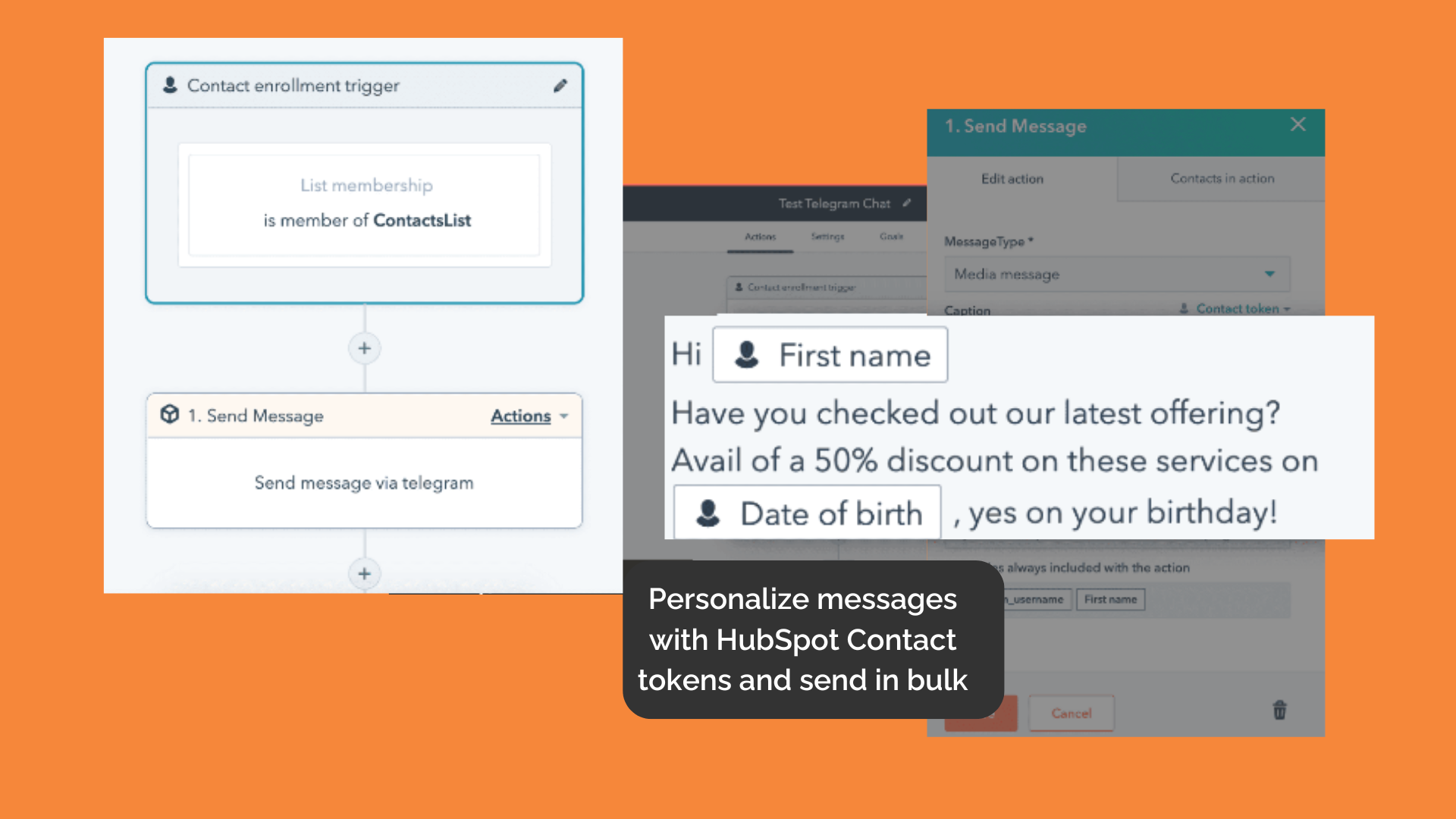 Create workflows in HubSpot to send bulk Telegram messages, including text and multimedia, while using contact tokens and custom properties to personalize each message for your audience.