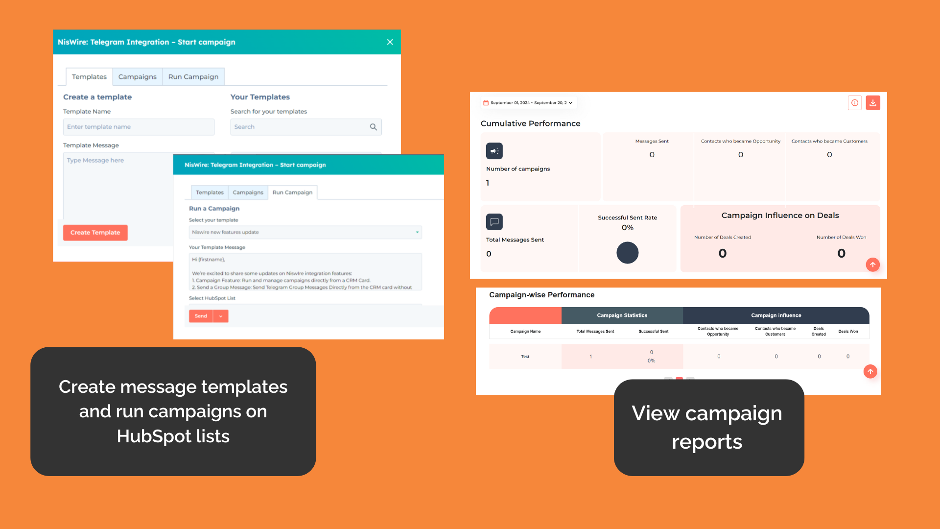 Using Niswire’s CRM card, you can create and manage campaigns with personalized message templates, send bulk text and multimedia messages, and enroll HubSpot contact lists for Telegram marketing. Niswire also tracks key metrics like messages sent, opportunities, deals, and customers, providing full insight into your campaign’s performance.
