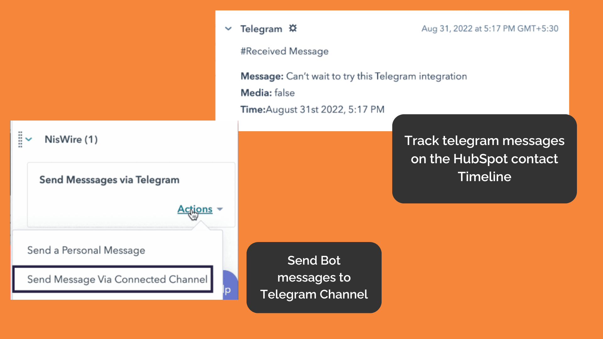 With Niswire, send bot messages to a Telegram channel using your Bot Key and Channel ID (one channel supported). Although channel or bot creation isn't available, all sent and received messages can be viewed on the HubSpot contact timeline, allowing your team to maintain conversation continuity with full context.