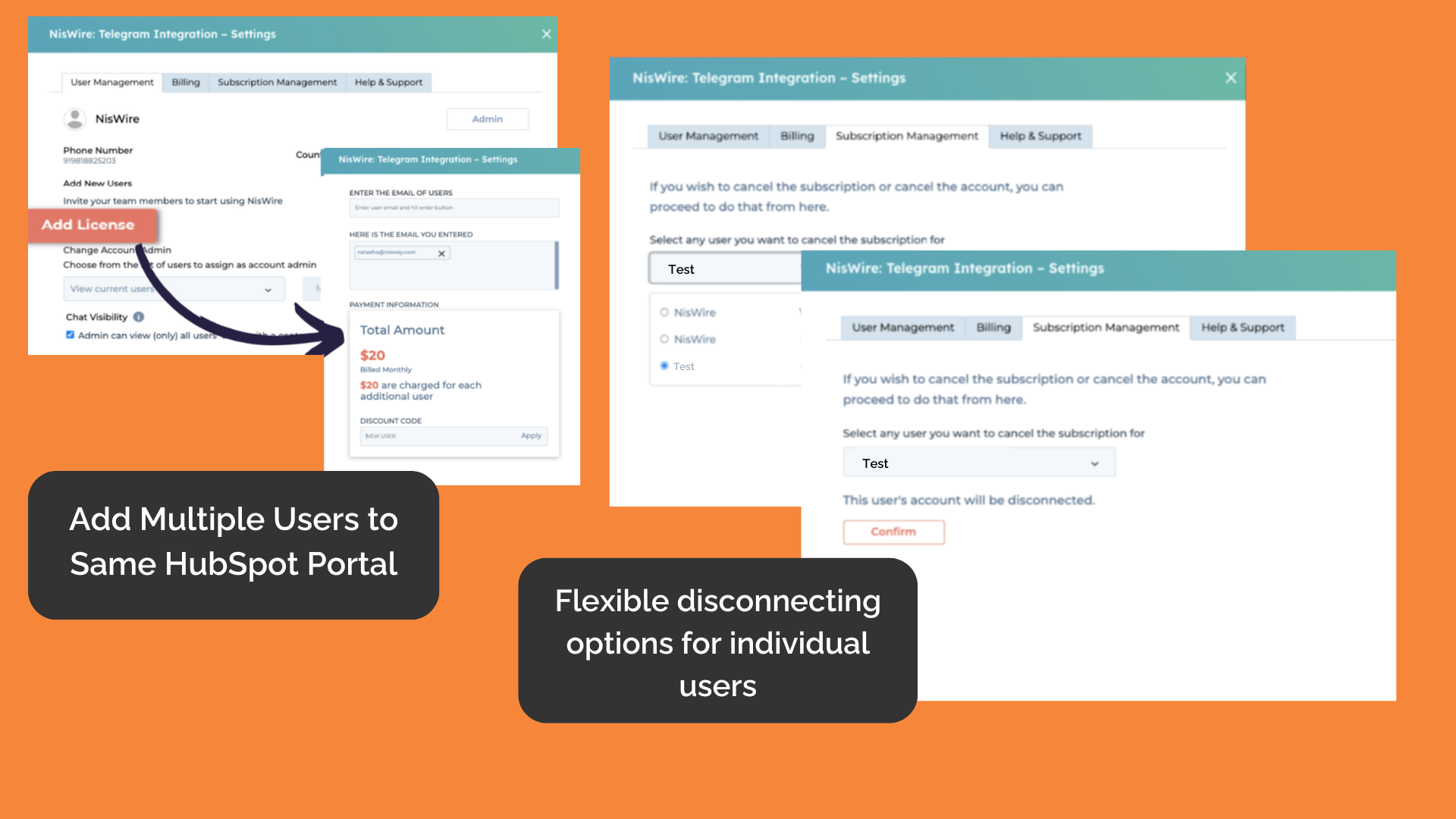The new NisWire version allows multiple phone numbers in one portal, with team access to the same numbers for efficient lead management. Easily add or remove users, reassign admin roles, and manage subscriptions with a few clicks, while keeping all conversations recorded in HubSpot.