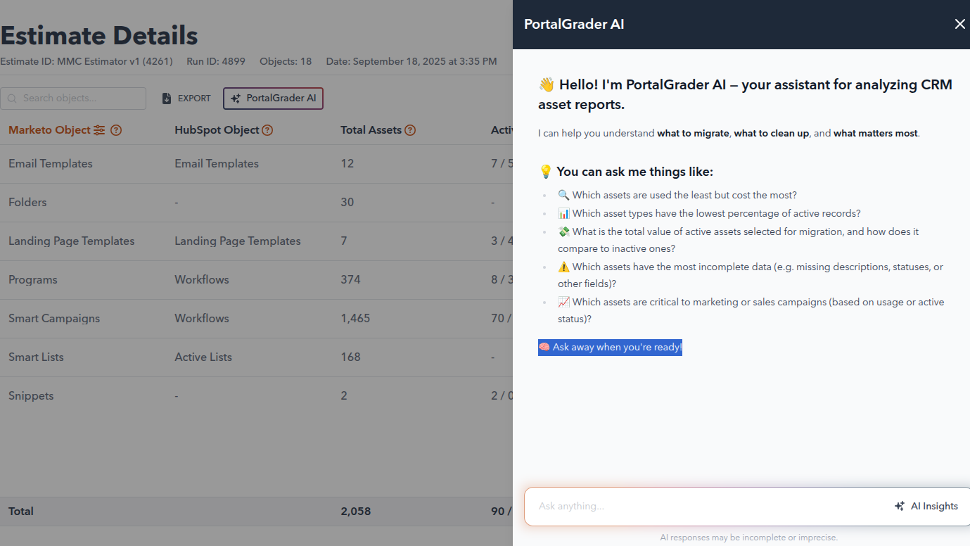This integration bridges that gap by bringing data-driven grading, benchmarking, and optimization insights right into HubSpot. By connecting with your HubSpot data, Portal Grader transforms asset evaluation from a manual, time-consuming process into an automated, insight-rich experience that empowers teams to make faster, smarter marketing decisions.