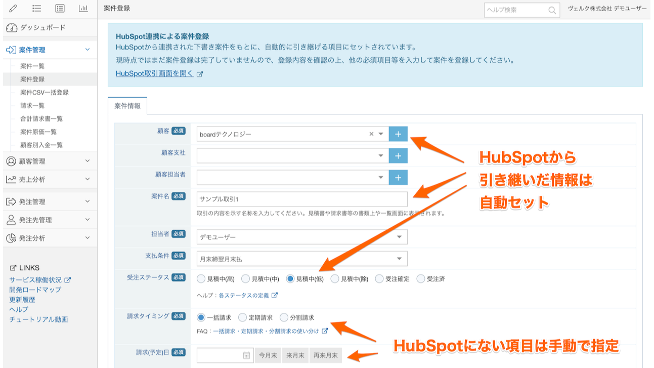HubSpotの「取引」をboardの「案件」へ連携できます。 HubSpotから連携された取引情報をもとにboard上で案件登録する際、顧客名・案件名・受注ステータスなど、HubSpotから引き継げる項目は自動的にセットされ、入力の手間を省けるようになっています。 連携後は、ステージと受注ステータスなどのいくつかの項目は、変更されたタイミングで随時、相互に同期されます。
