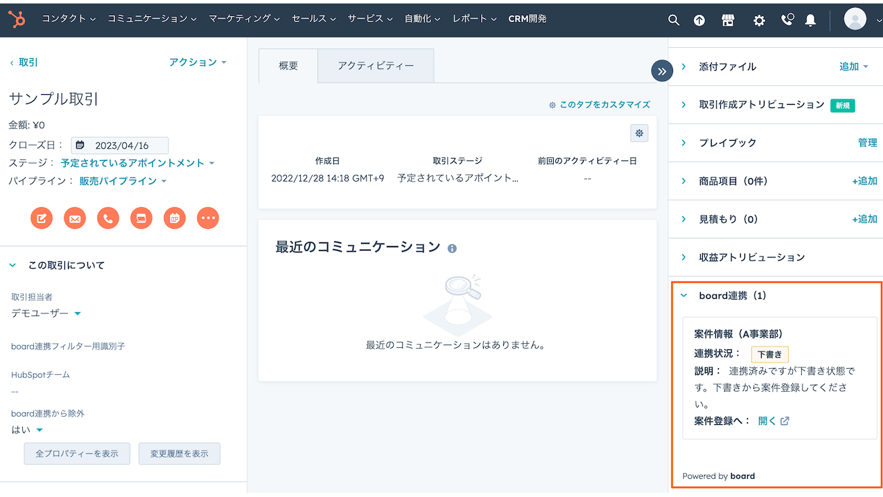 HubSpot取引画面右下に、boardとの連携状況が表示されるようになります。 ここからboardの案件情報・見積書編集画面へ移動できます。