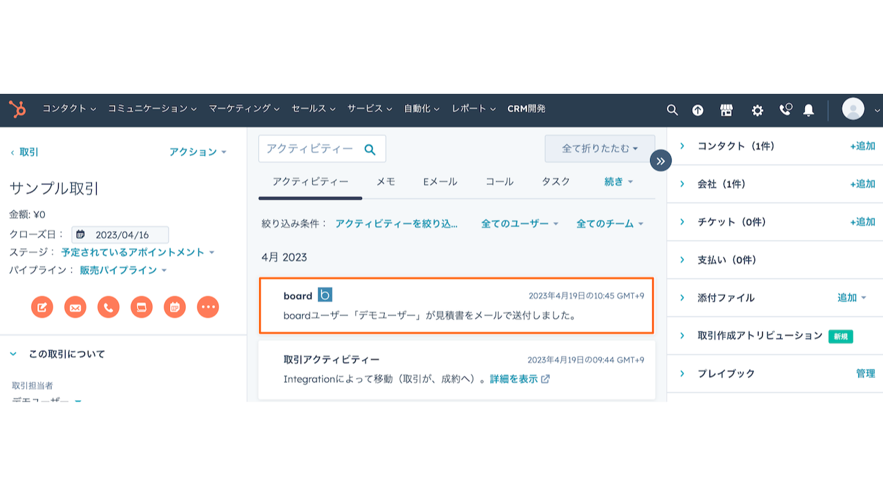 見積書などの書類をboard上からメール・郵送・電子契約サービス経由で送付すると、取引のアクティビティーに、その履歴が表示されます。 これにより、HubSpot上でも、書類の発行状況を確認できます。