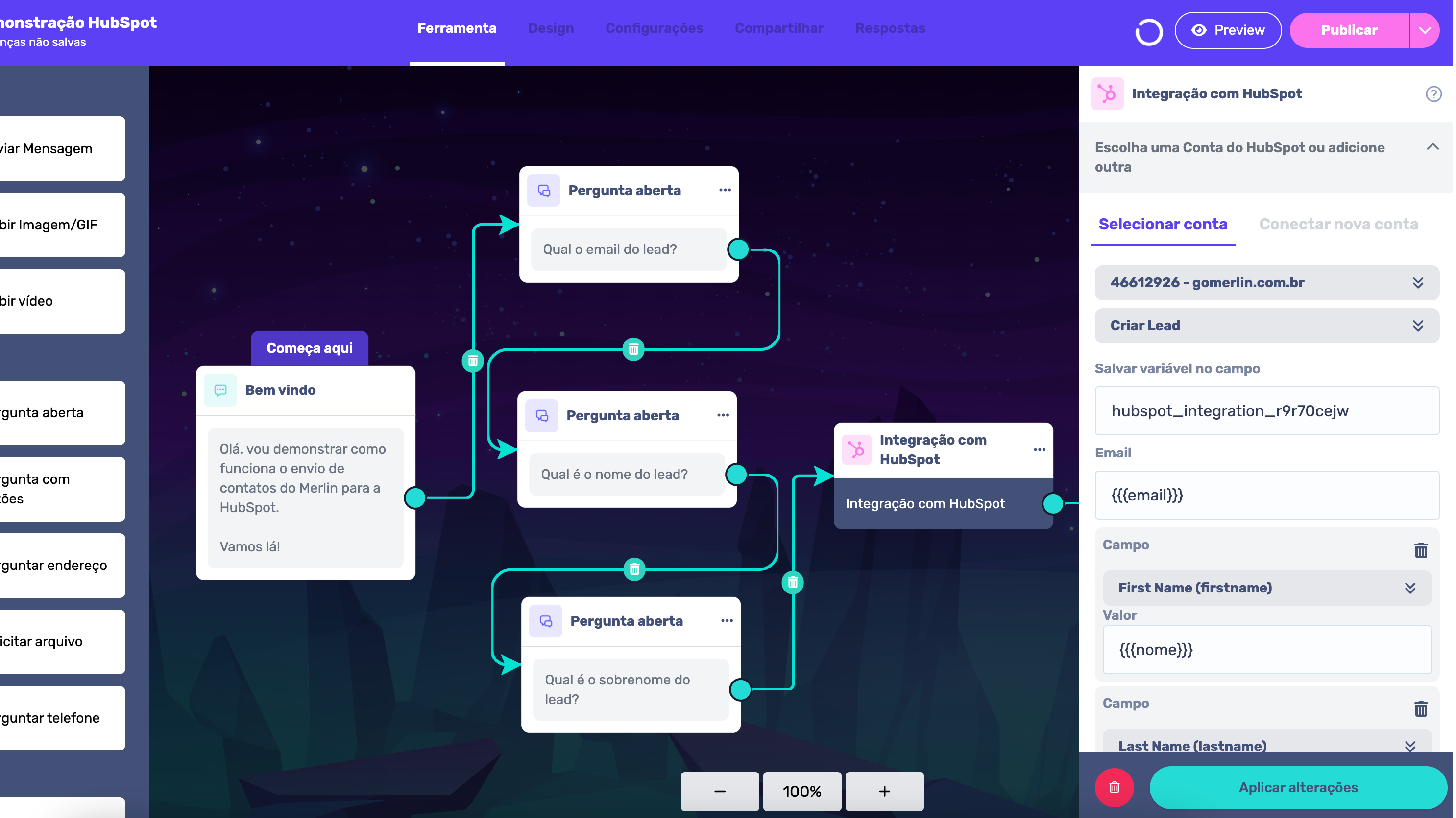 Com o Merlin é possível coletar informações dos seus leads e enviar diretamente para o HubSpot CRM.