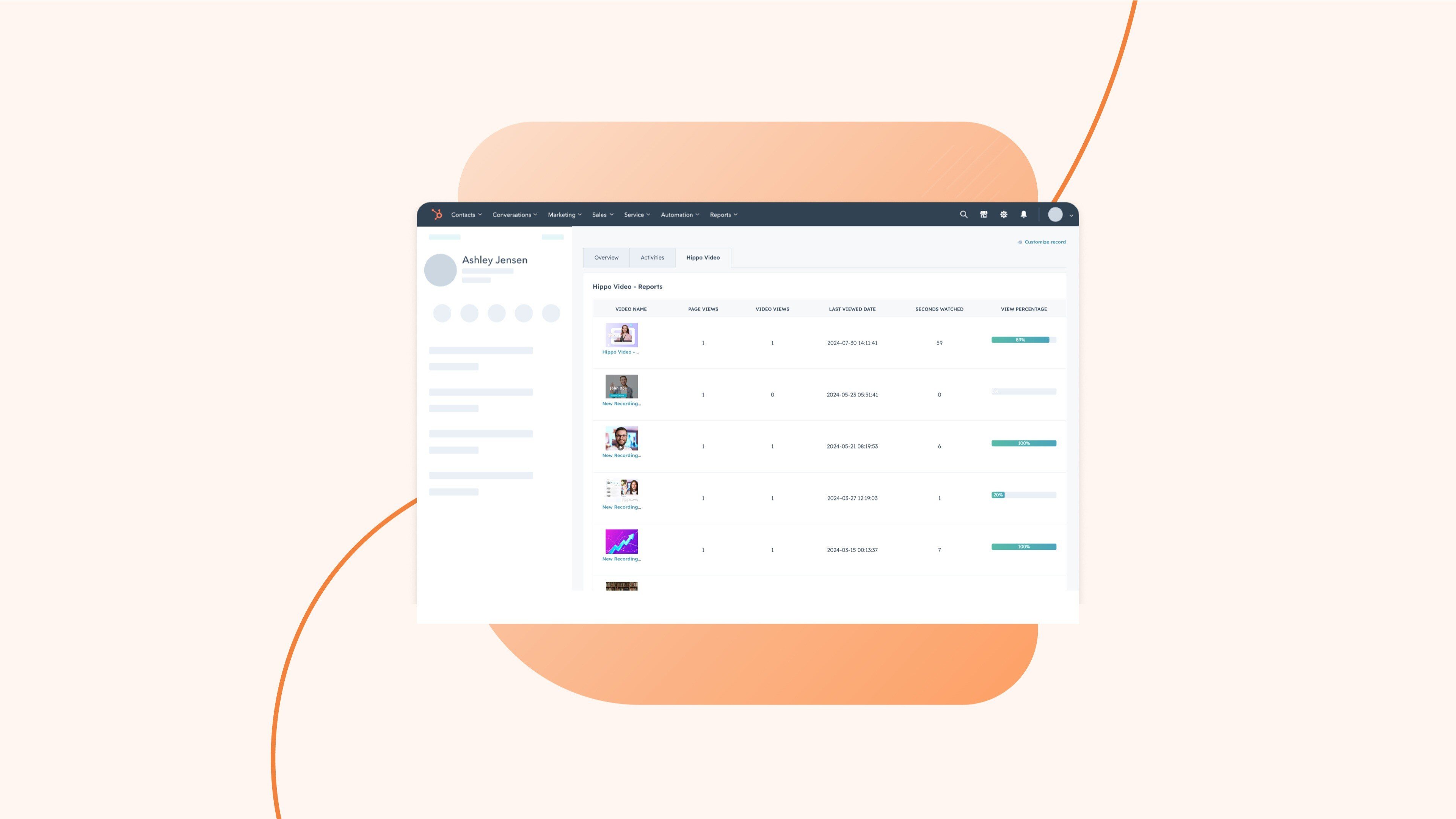 The App Card, Hippo Video Reports, tracks detailed video engagement metrics like Total Views, View Percentage, and more directly within the HubSpot dashboard. This way, Identify high-intent leads, understand their interests, and accelerate your sales cycle.
