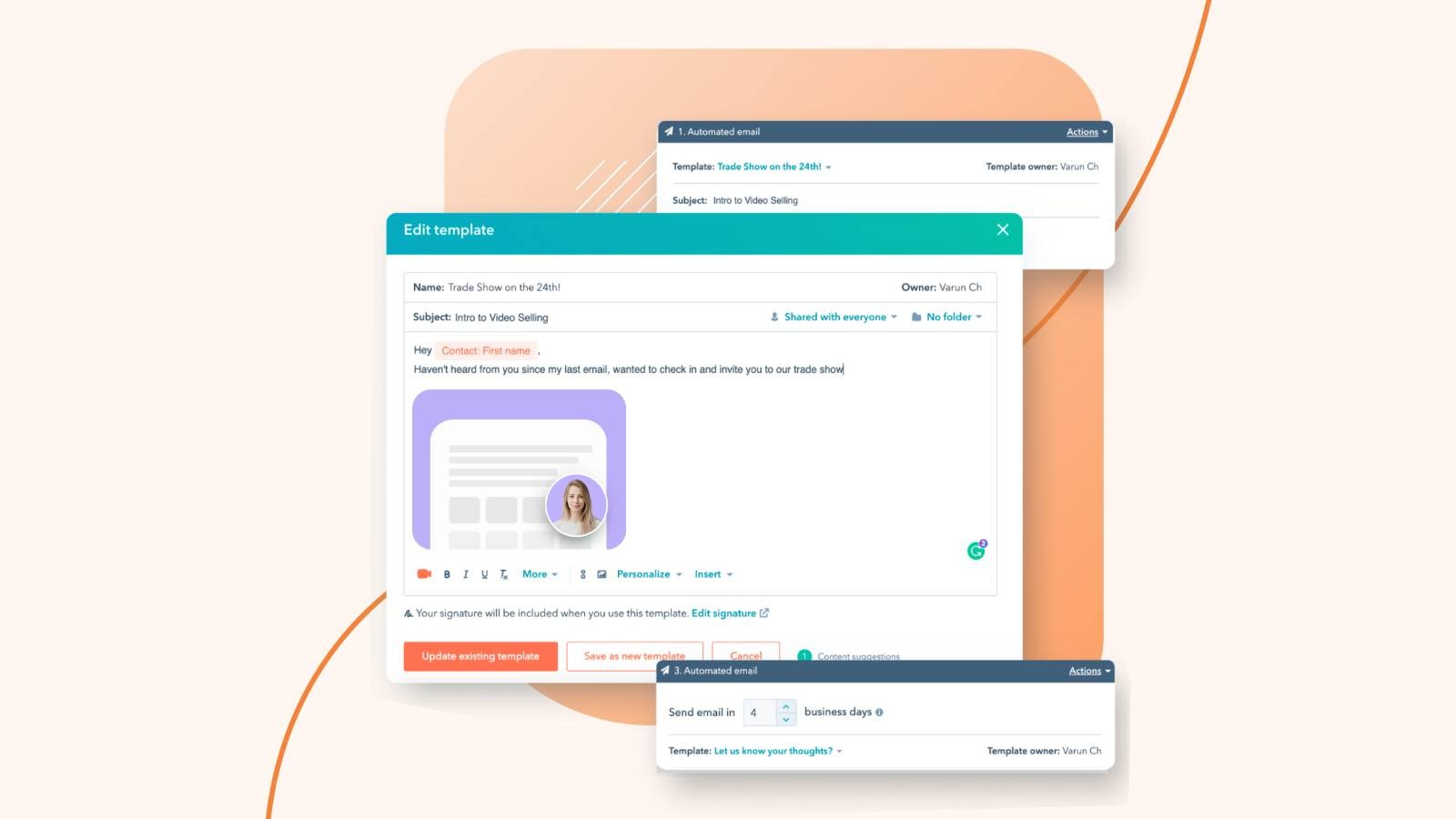Add personalized videos in your HubSpot sequence automatically whenever you enroll a contact. Hippo Video uses AI to generate 1000s of personalized versions from just one original video and adds it to your sequence before sending. Supercharge engagement with minimal effort.