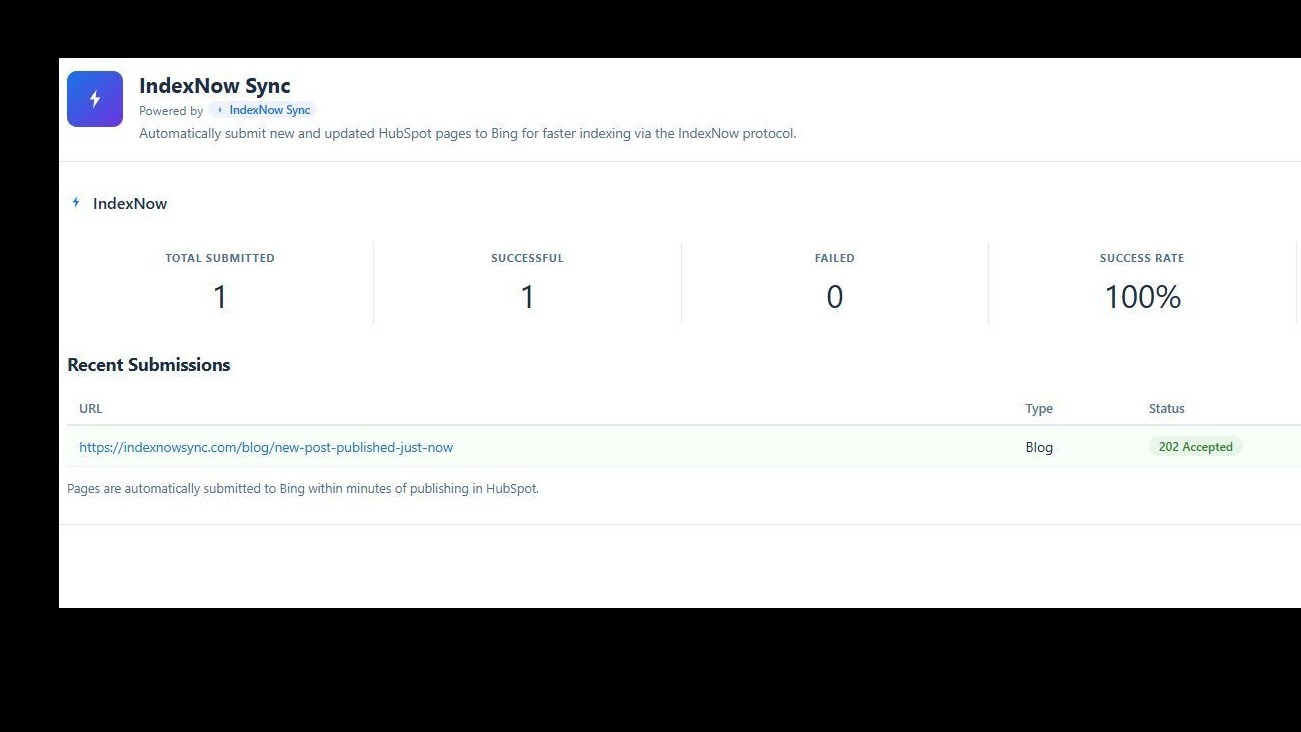 Every time you publish a page or blog post in HubSpot, IndexNow Sync automatically submits the URL to Bing via the IndexNow protocol. No manual work needed — your content reaches Bing's index within minutes instead of days.