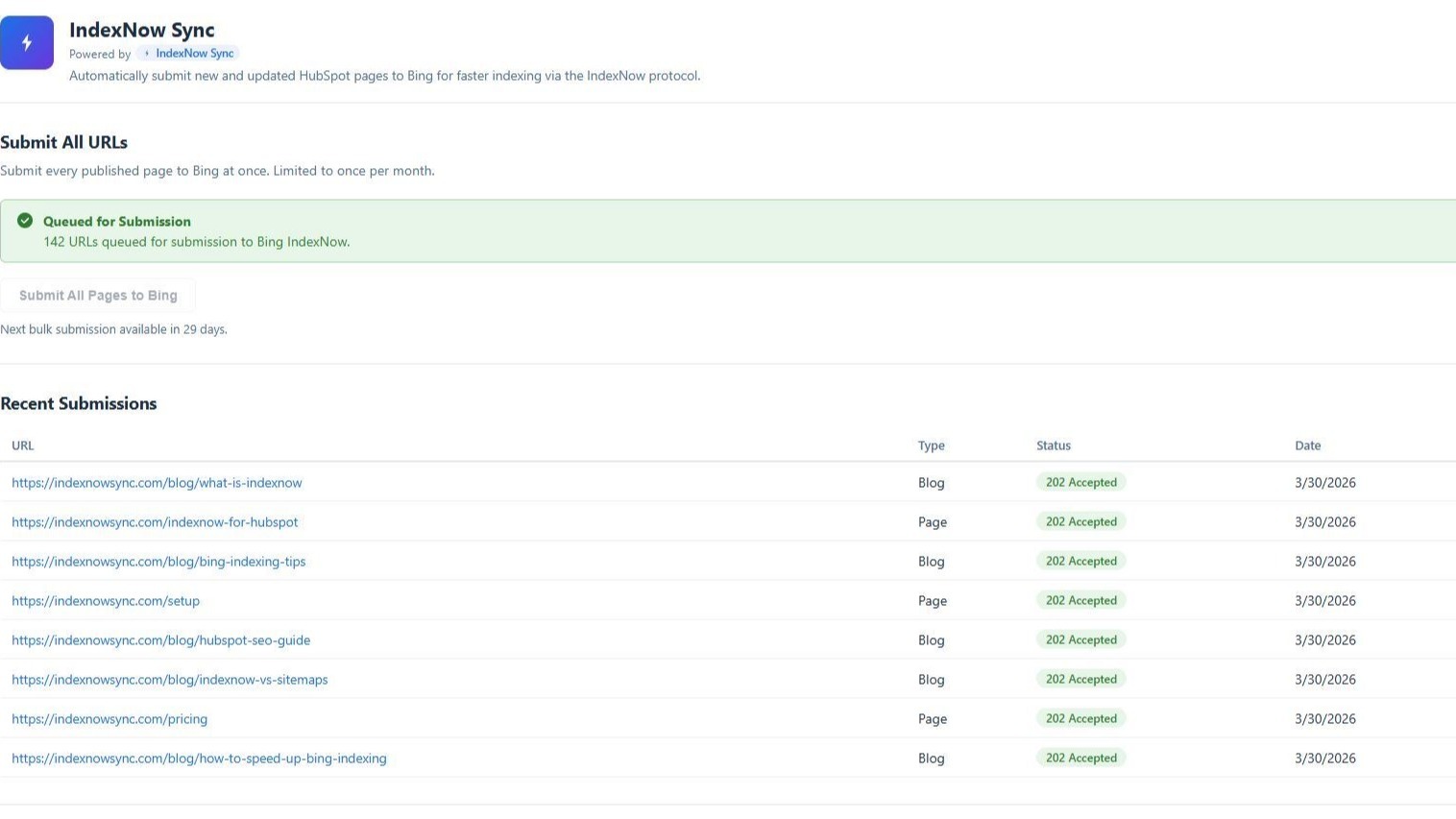 Track every IndexNow submission from the last 30 days directly inside HubSpot. See which pages were submitted, when, and whether the submission was successful — all without leaving HubSpot.