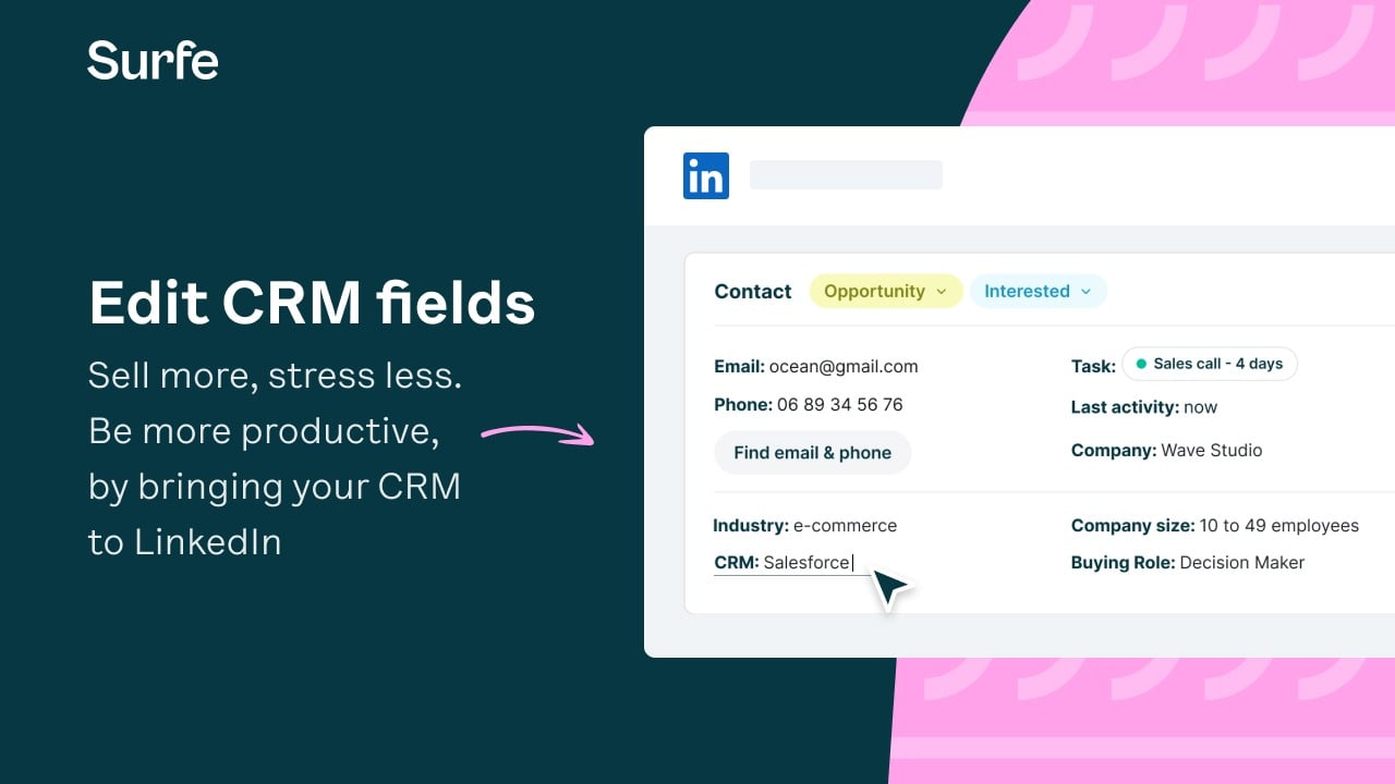 Be more productive, by bringing & editing your HubSpot fields in LinkedIn: Surfe embeds your HubSpot CRM in LinkedIn, meaning no need to switch tabs for getting or editing CRM information.