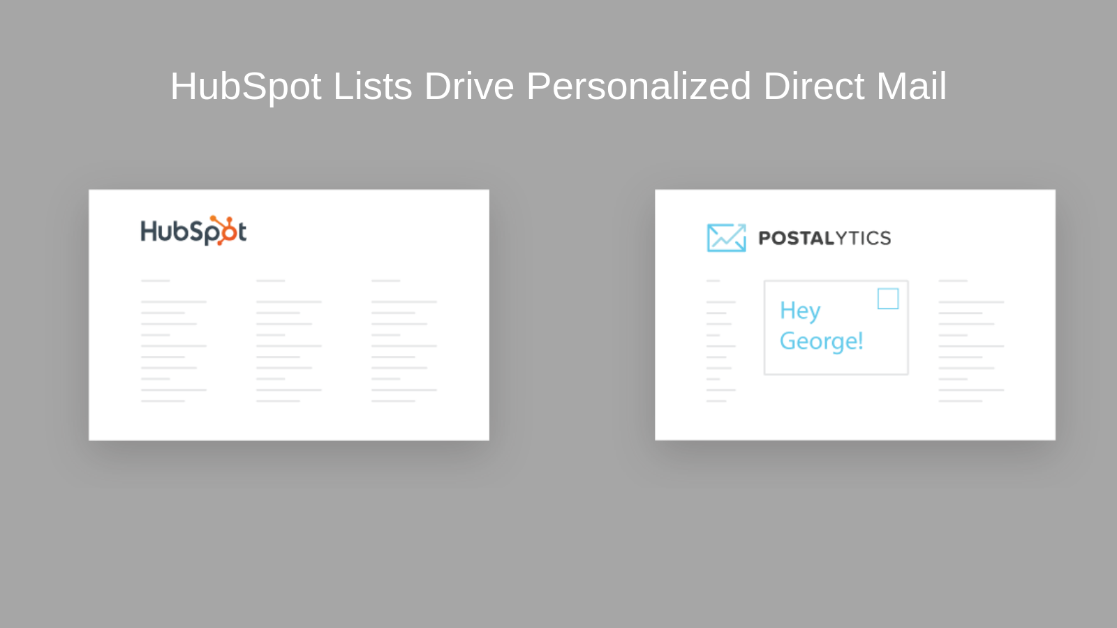 Pull lists that you define in HubSpot directly into Postalytics for instant direct mailing, along with up to 35 fields of data that populate your personalized direct mail and drive dynamic content.