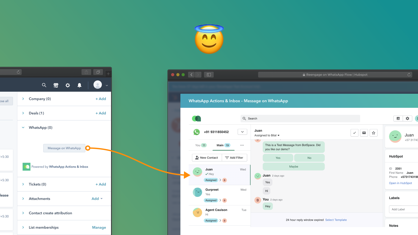 With WhatsApp Actions, it is now possible to send messages to your contacts on WhatsApp right from your HubSpot workflows and chat with contacts on WhatsApp
