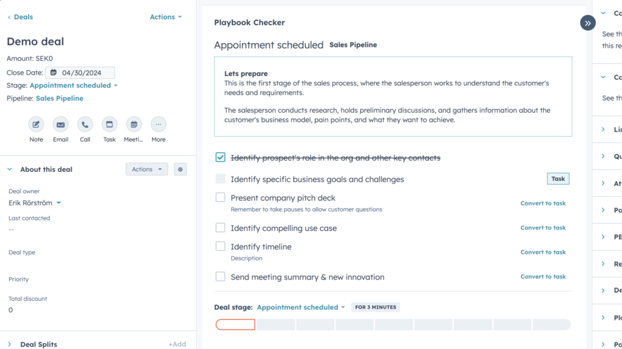 A key feature is its ability to convert important checklist items into HubSpot Tasks, assigned directly to the right salespeople. While some steps are simple reminders to ask certain questions, others—like sending a quote—become actionable tasks that ensure key actions are completed. This helps streamline daily operations and reduces the risk of missed follow-ups.