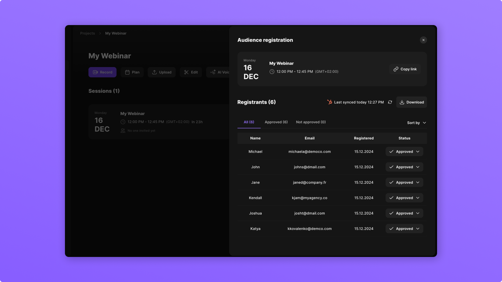 Automatically enrich your HubSpot CRM with valuable data from your webinars and live events. Collect key attendee details like names, email addresses, and participation history, giving your team actionable insights to personalize campaigns and improve customer experiences.