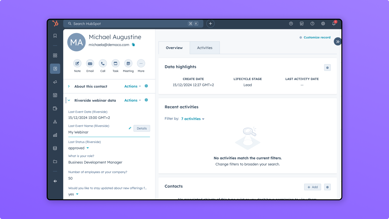Automatically carry over details of registrants from webinars and live events you host on Riverside into HubSpot. This means easier lead tracking, customer management, and audience nurturing.