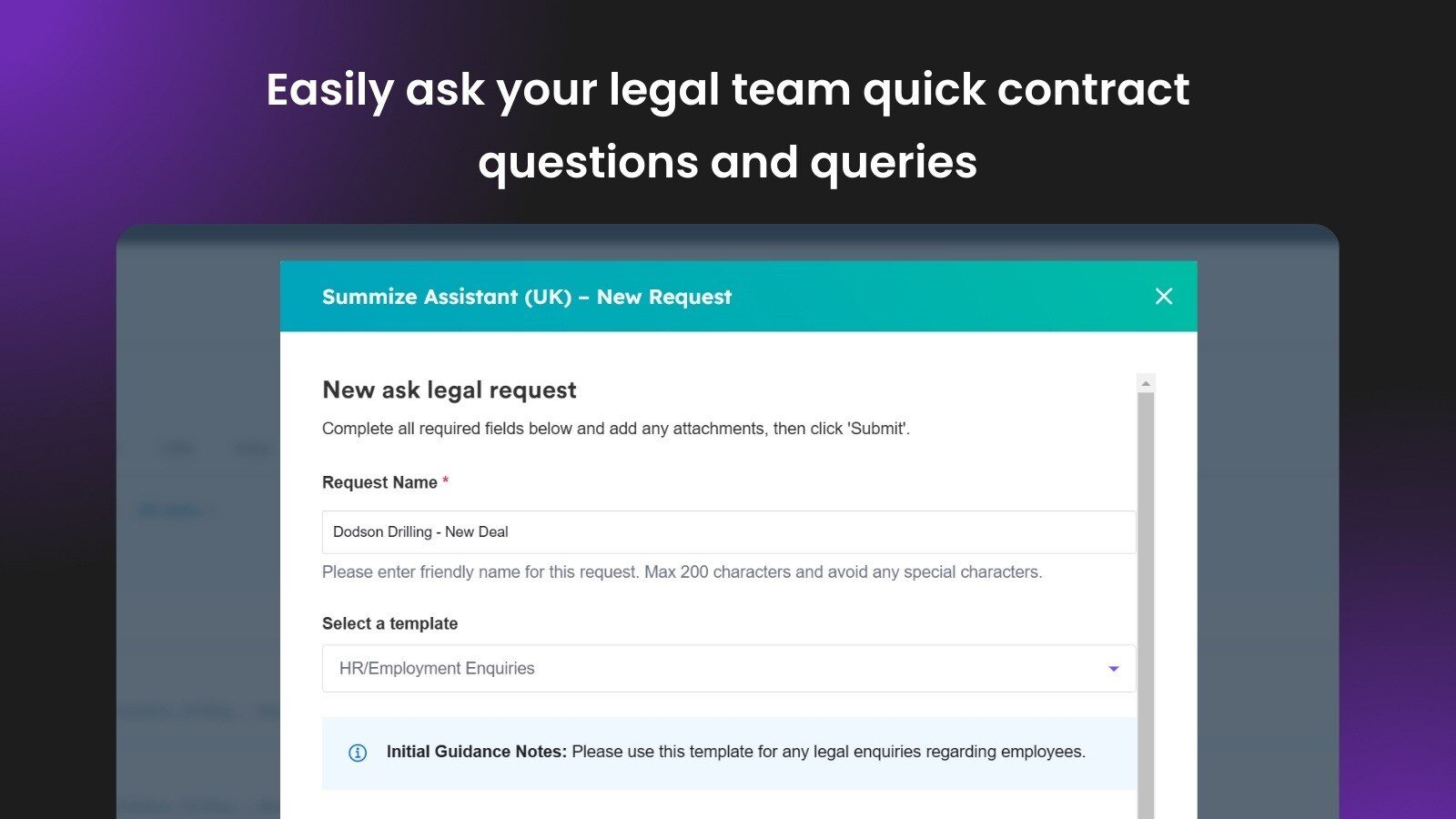 If you need to ask your Legal team a question, about a contract or a general legal query, simply Ask Legal directly from HubSpot and access all live and previous conversations within your company and deal records.