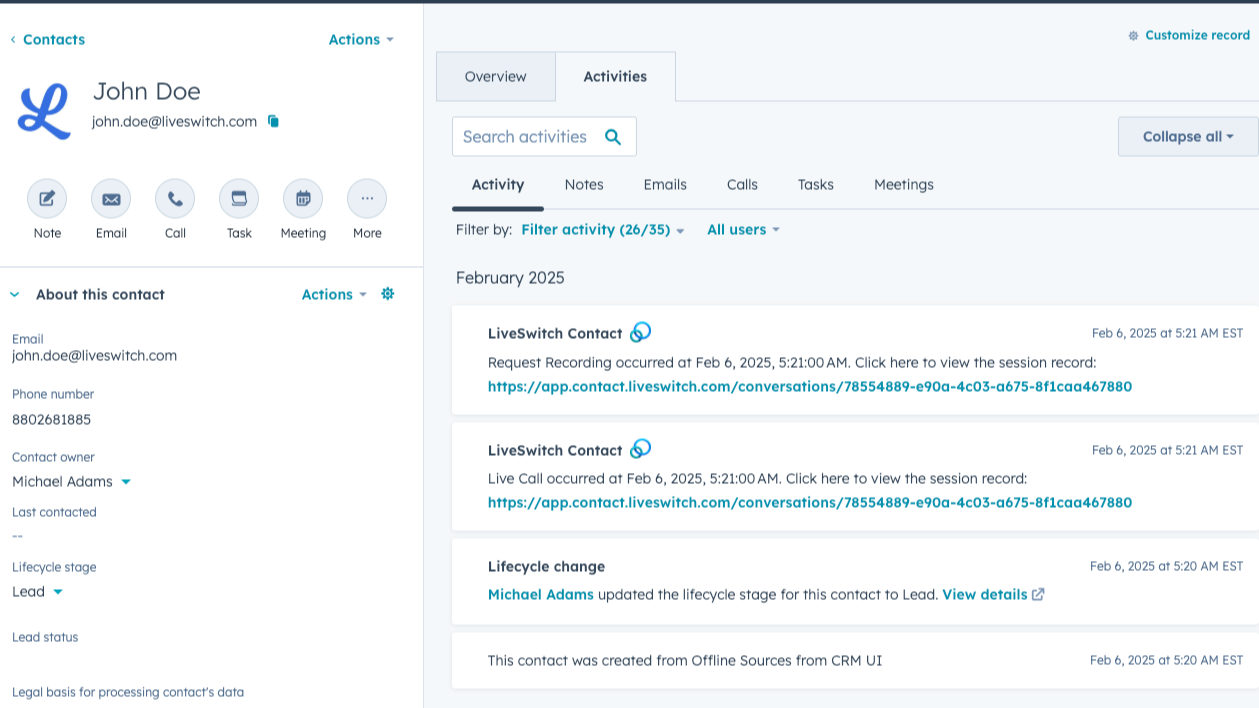 Automatically add a timeline event on a HubSpot contact record anytime a LiveSwitch Live Call or Request Recording session link is sent to that contact.