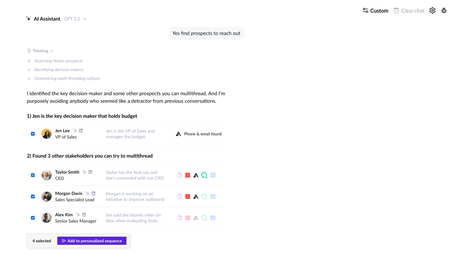 Nooks 是智能外呼的代理工作区--在这里,人工智能代理和您的销售代表携手合作,将实时信号转化为销售管道。