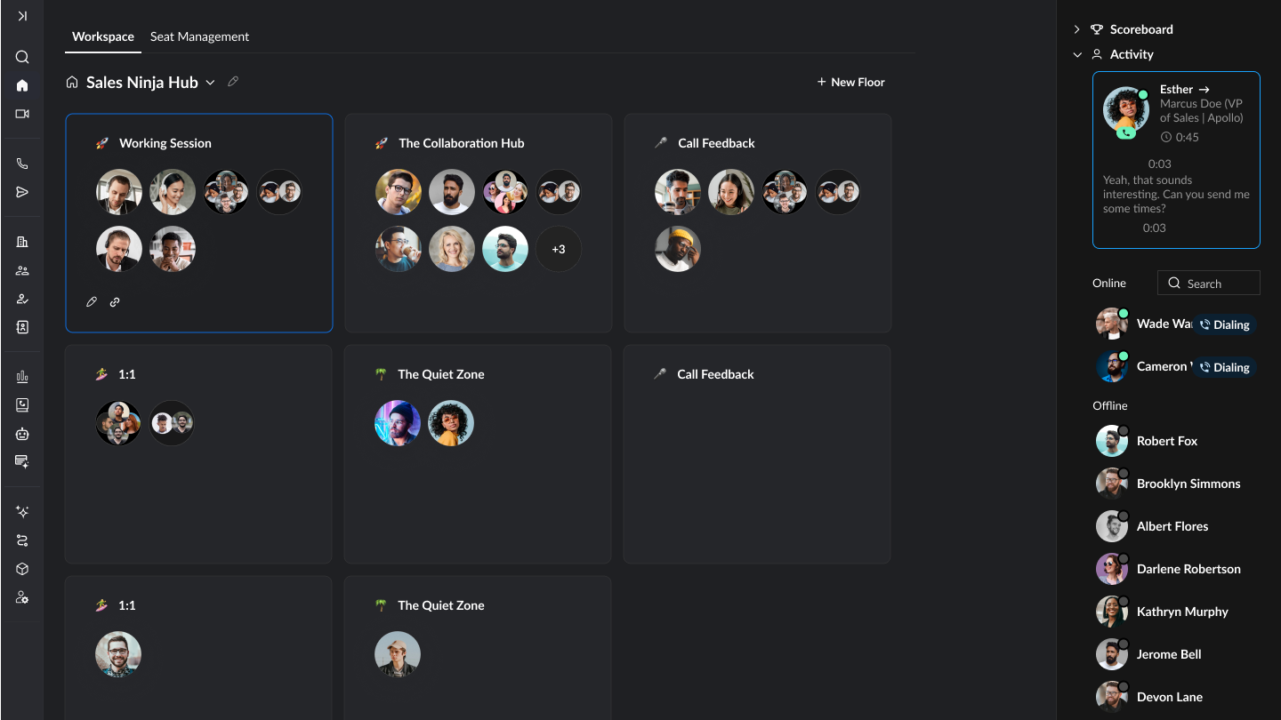 Nooks Virtual Salesfloor 使您的 SDR 团队保持实时联系、激励和相互指导,就像一个完全远程的实体销售大厅。
