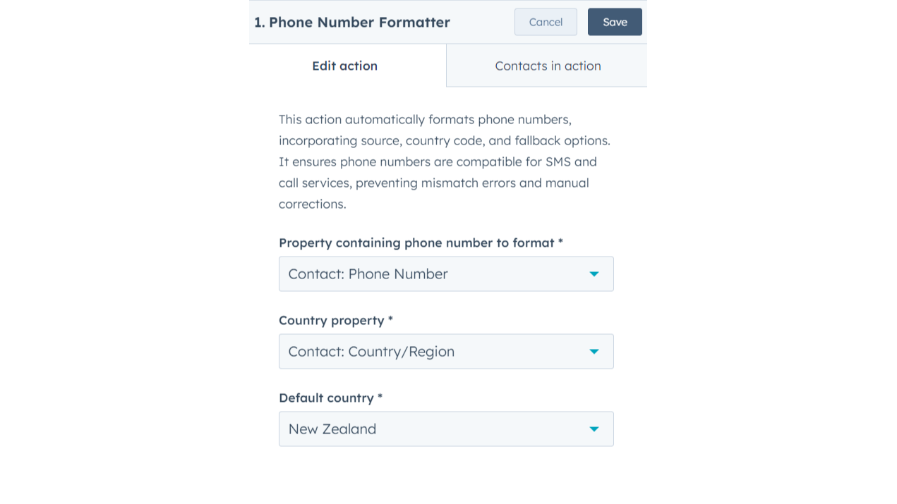 Automatically format phone numbers, incorporating source, country code, and fallback options. It ensures phone numbers are compatible for SMS and call services, preventing mismatch errors and manual corrections.